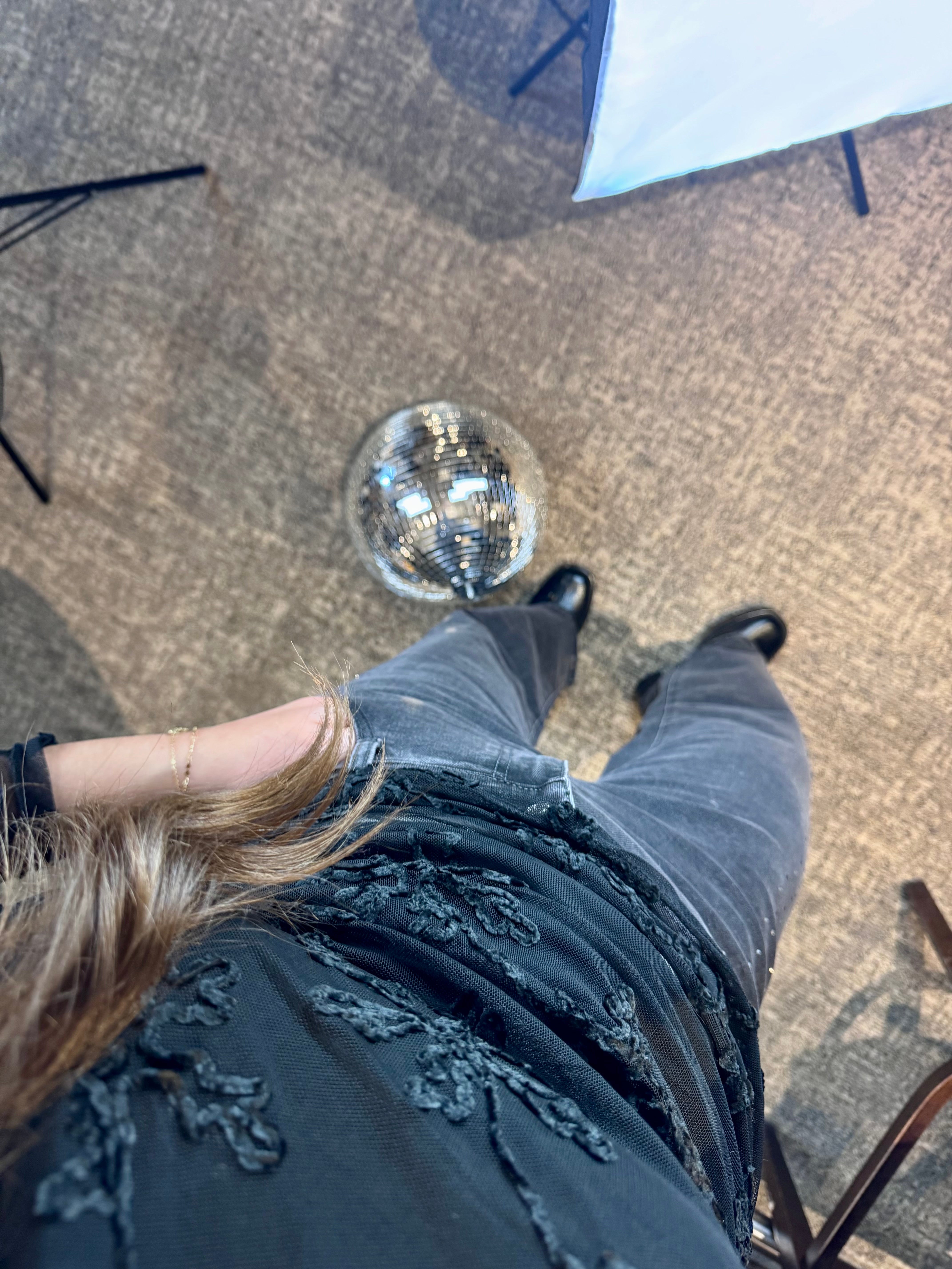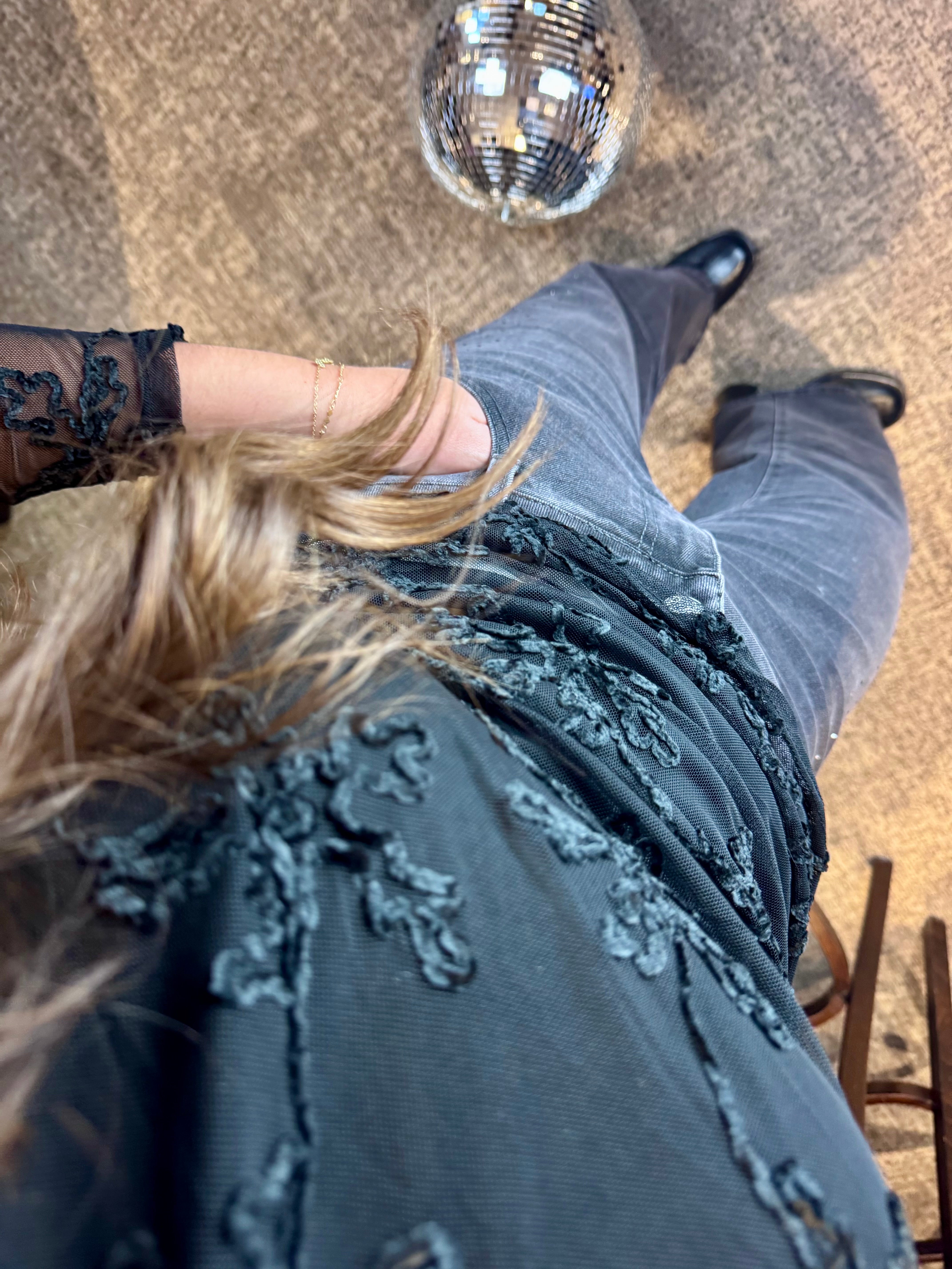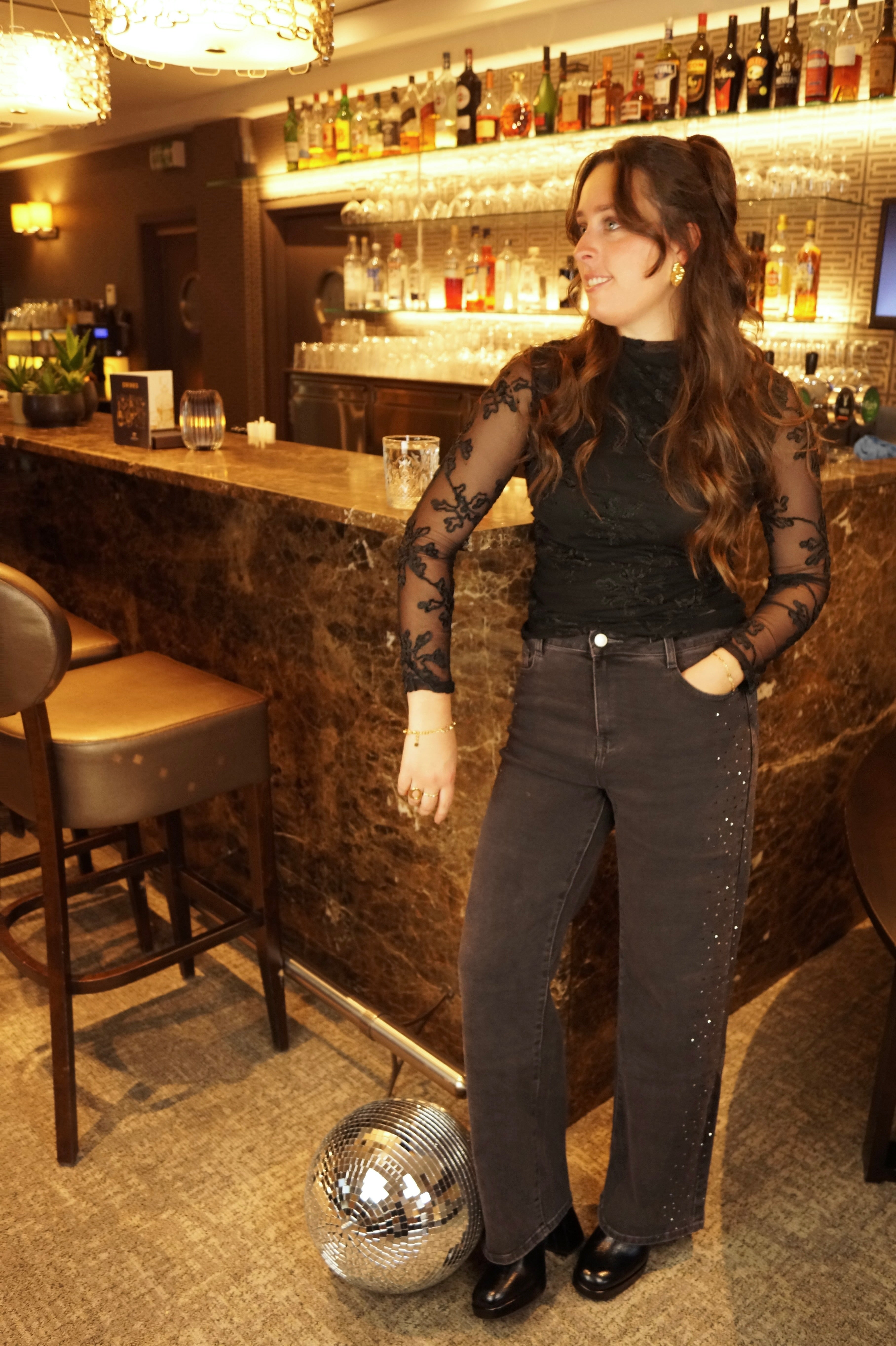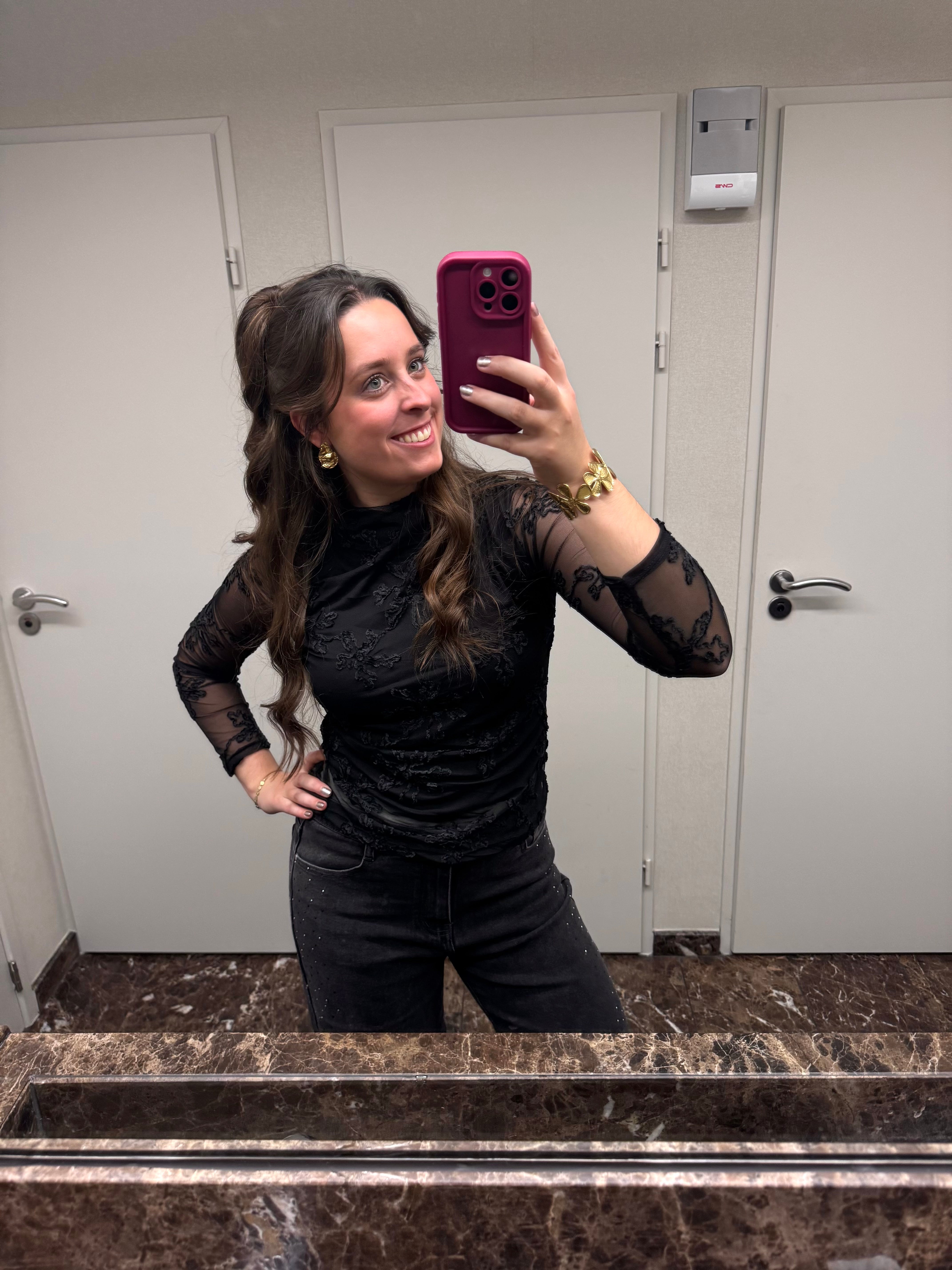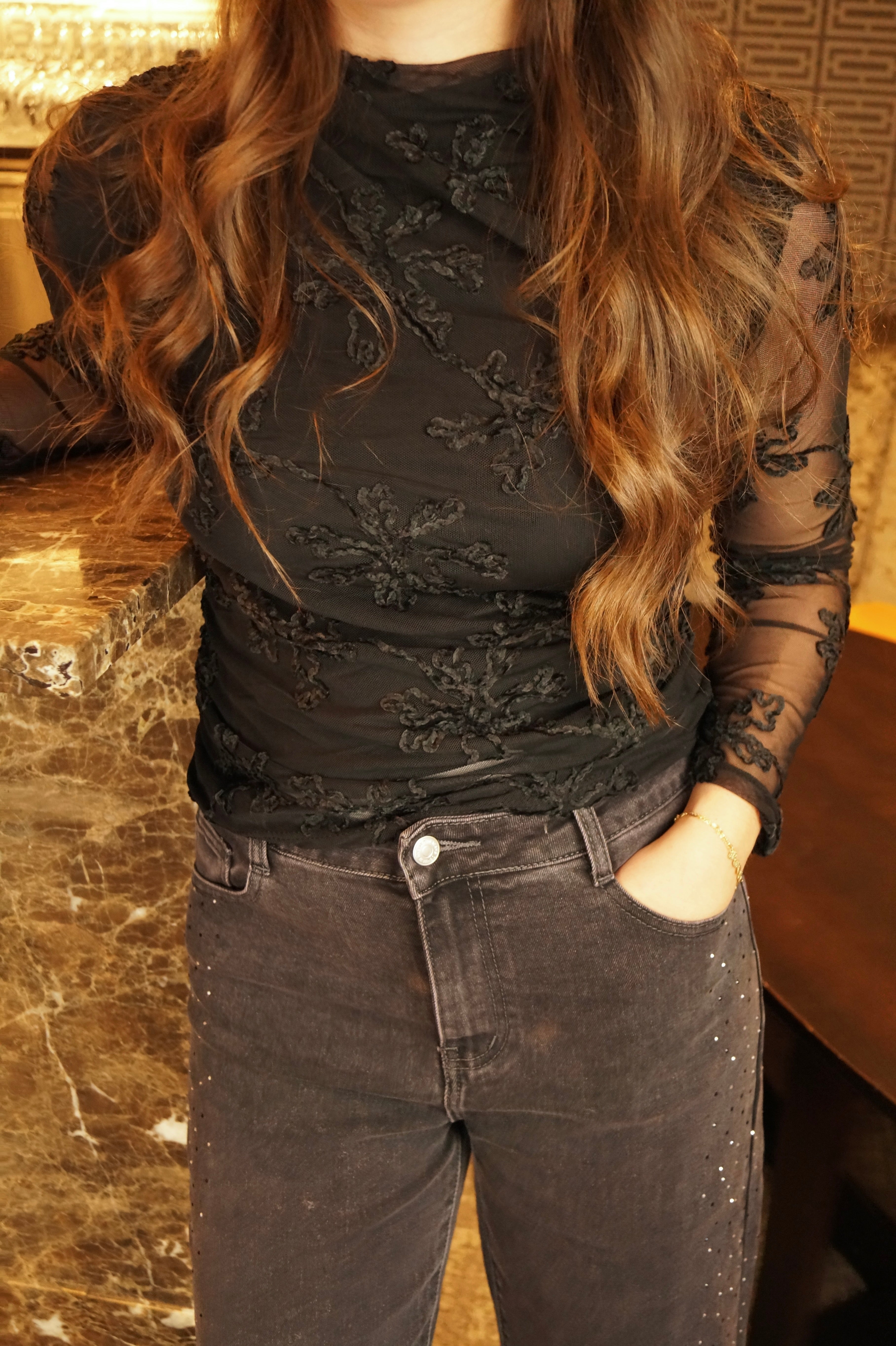 Zwarte longsleeve met een speels detail: semi-transparante kanten mouwen met een prachtig bloemenpatroon. Het contrast tussen de ondoorzichtige stof en de fijne kant aan de mouwen geeft dit stuk een verfijnde, romantische uitstraling. Perfect voor wie graag een vleugje elegantie toevoegt aan haar dagelijkse garderobe. Een veelzijdig basisstuk dat moeiteloos van dag naar avond gaat.