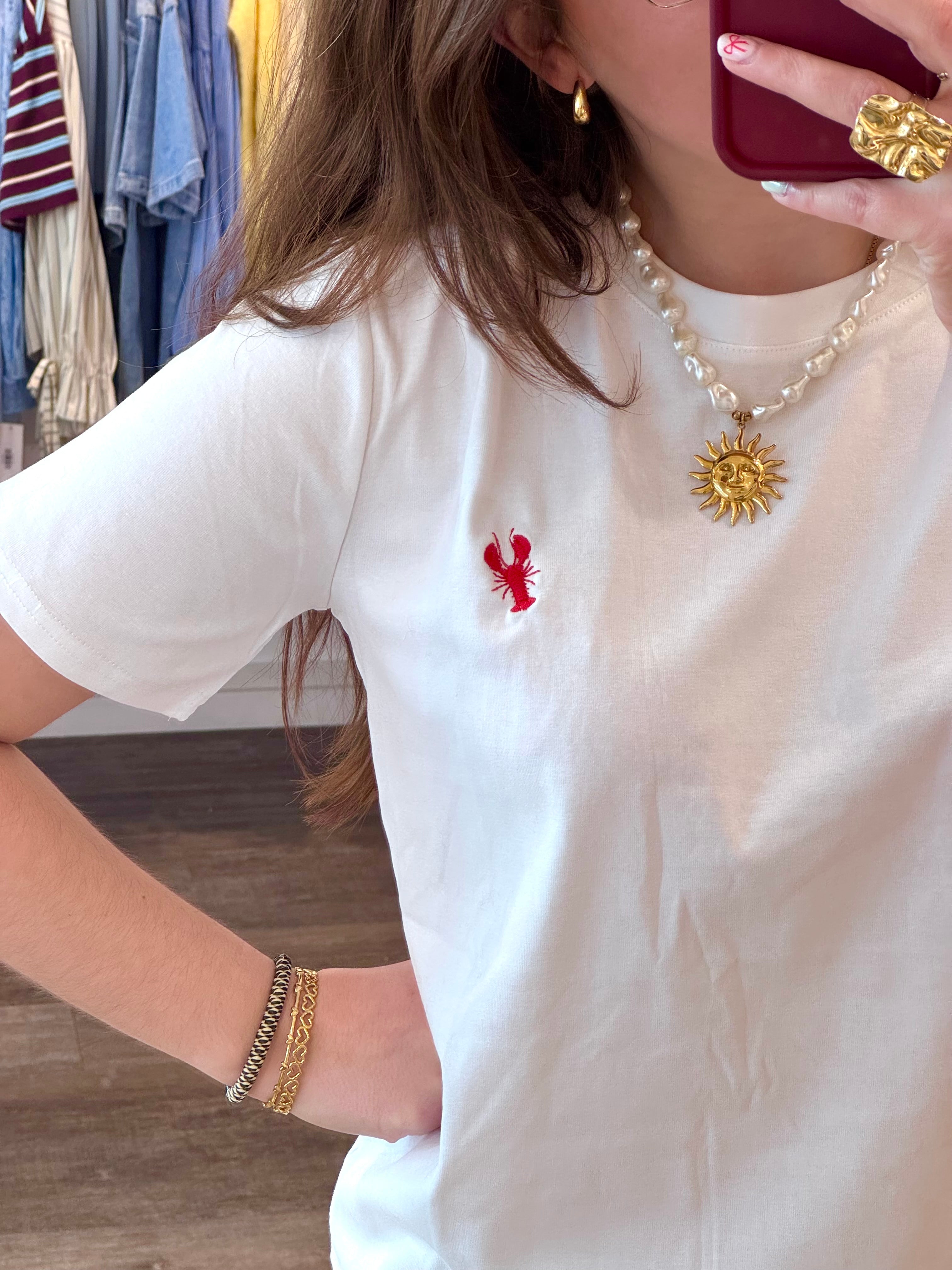 Dit klassieke witte t-shirt wordt een echte eyecatcher dankzij het schattige rode lobster-design op de voorkant. Het subtiele printje geeft je outfit net dat beetje extra karakter zonder overweldigend te zijn. Perfect voor dagelijks dragen. Comfortabel & stijlvol!