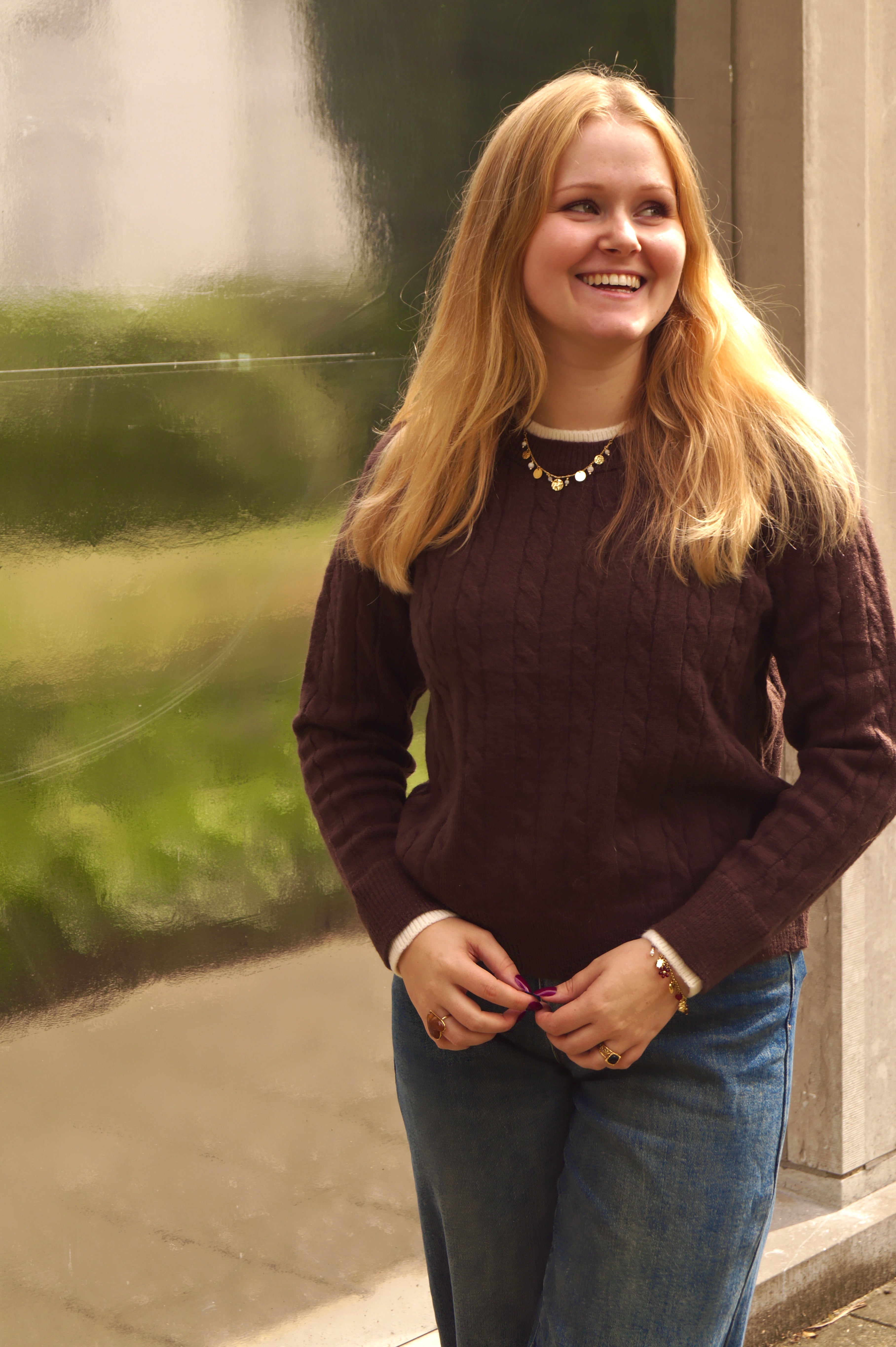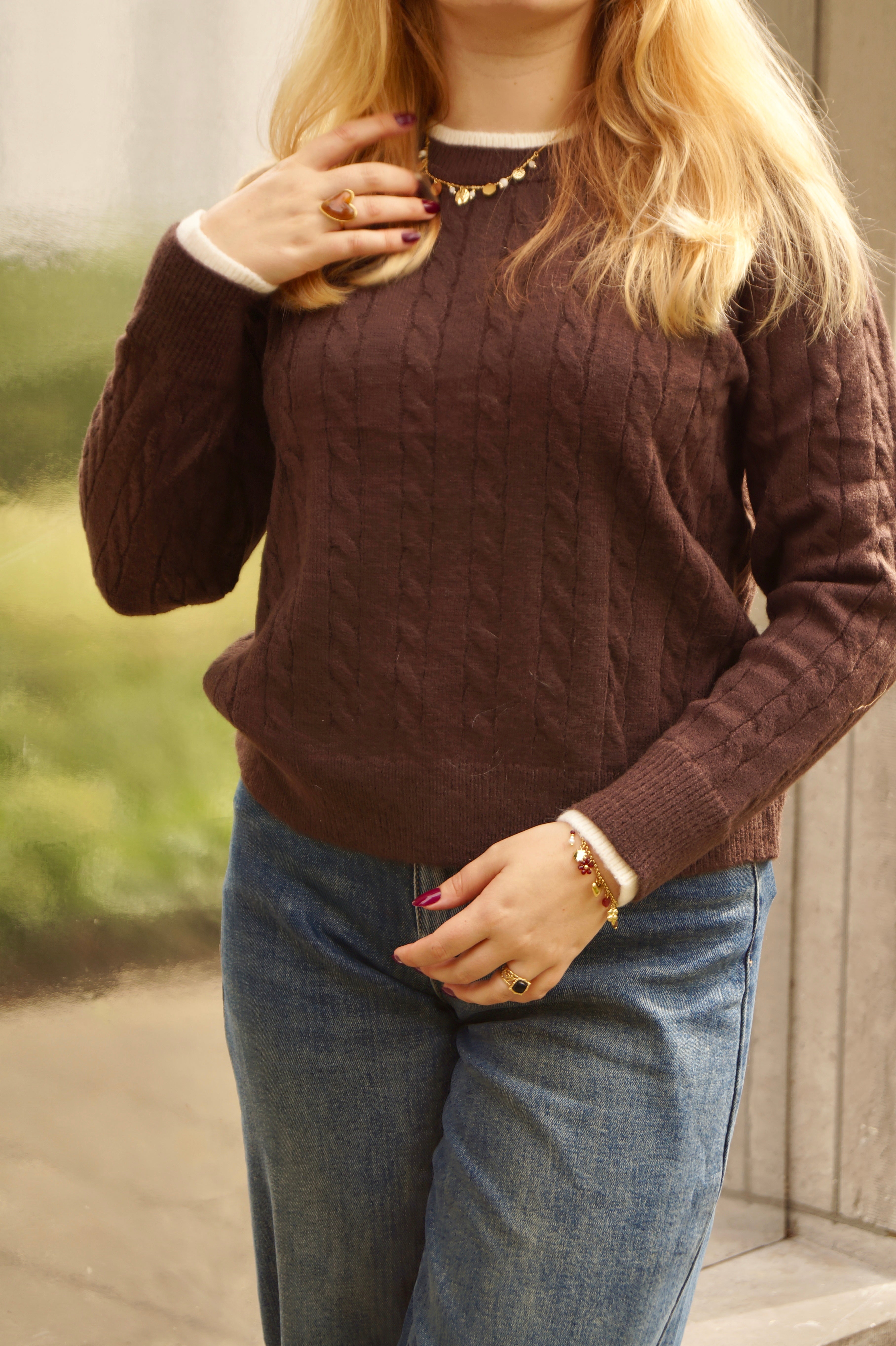 Ontdek deze gezellige bruine pull met chique witte accenten aan de mouwen en hals! Perfect voor een relaxed weekend-look of casual dagje uit. De witte hals en details geven net dat extra touch van stijl. Comfortabel, veelzijdig en absoluut een must-have in je garderobe. Draag het met je favoriete jeans of een rokje – deze pull past overal bij!