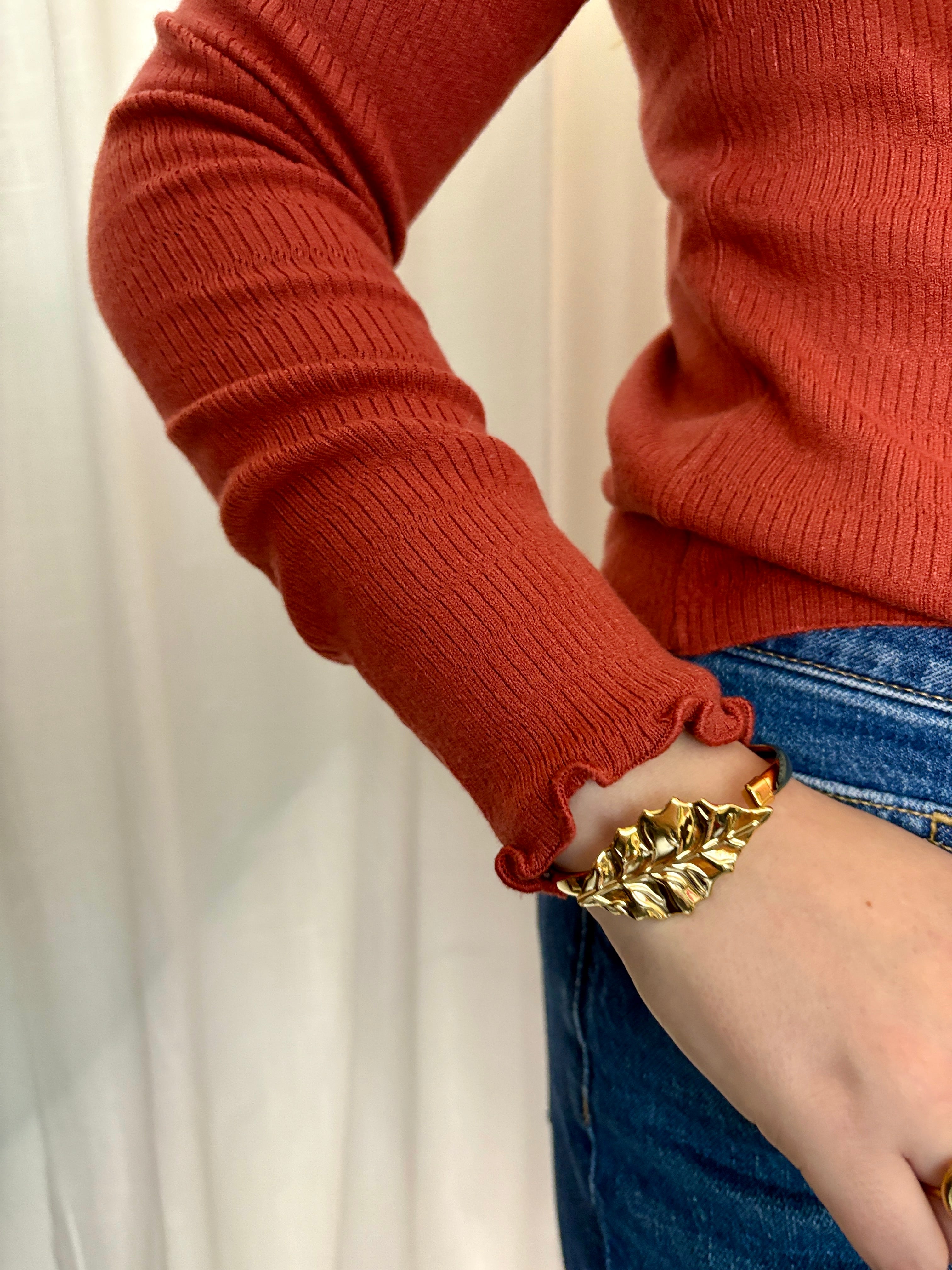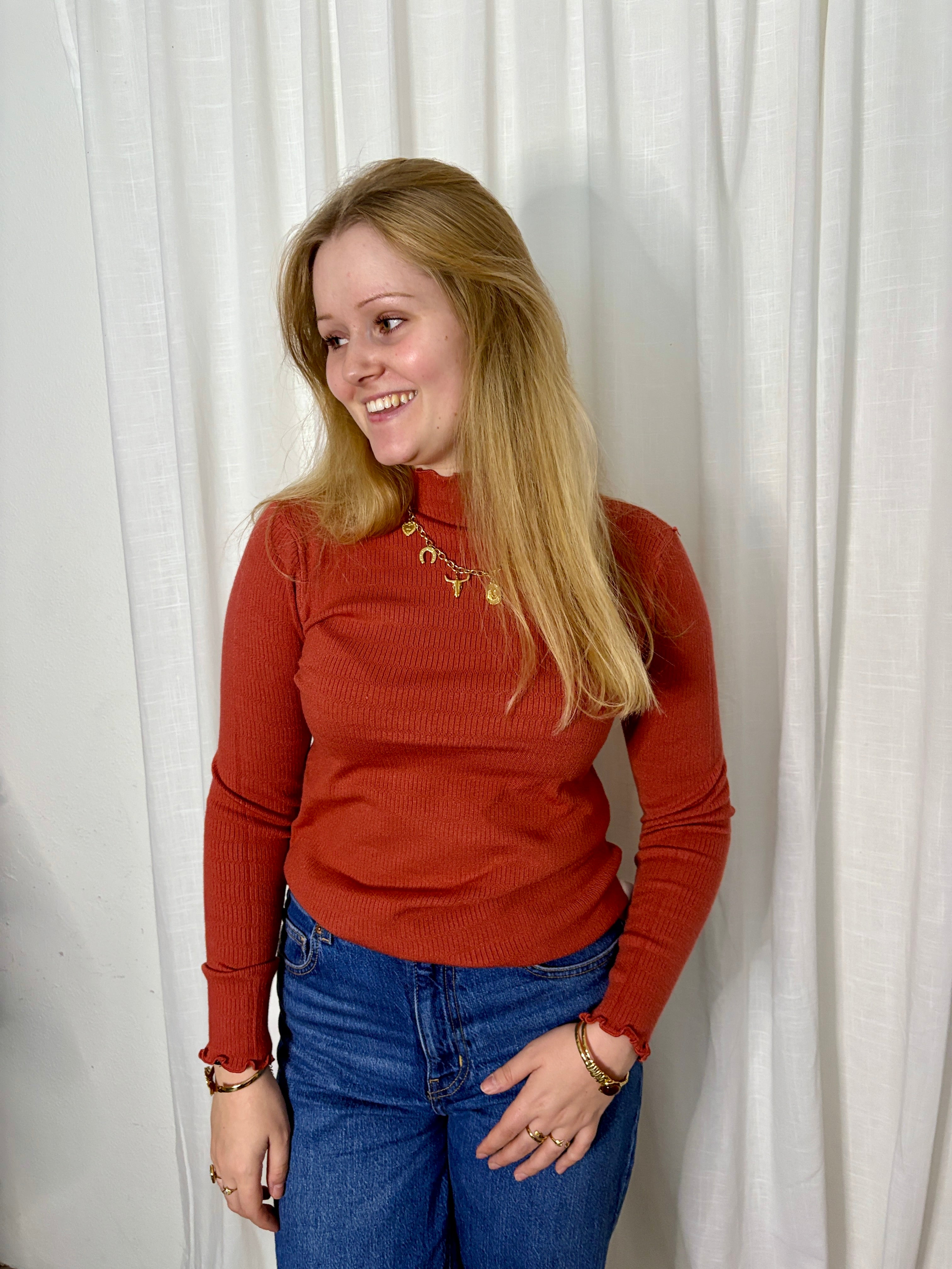 Warme terracottatinten gaan hand in hand met gezellig comfort in deze top met lange mouwen, jouw nieuwe herfstessential! Dit kledingstuk is perfect om laagjes mee te creëren gedurende het seizoen en heeft die prachtige herfstkleuren waar iedereen dol op is. Trek hem aan en geef jouw dagelijkse stijl meteen een boost met een vleugje seizoensgebonden warmte. Deze top is klaar voor al jouw herfstavonturen.