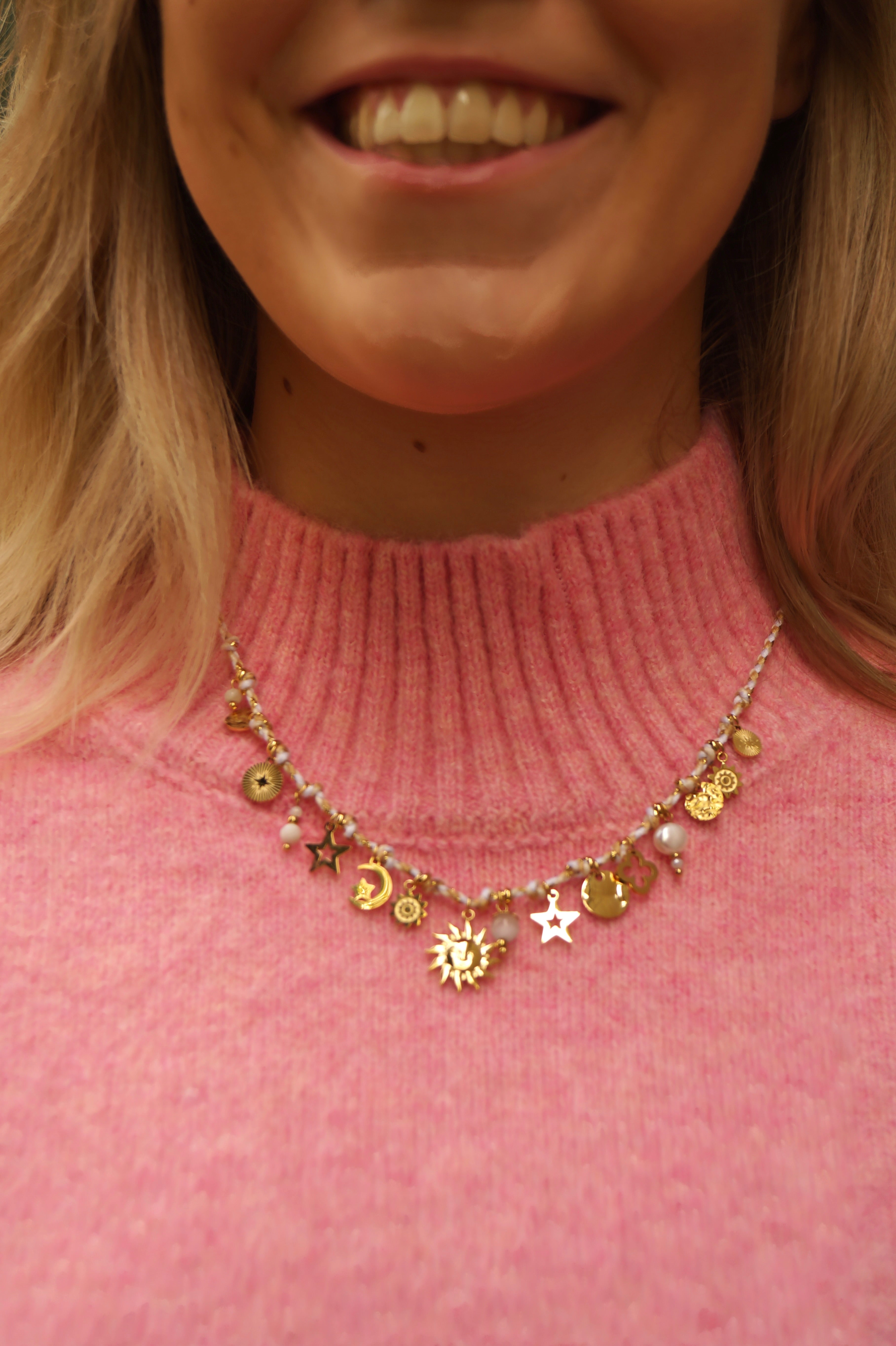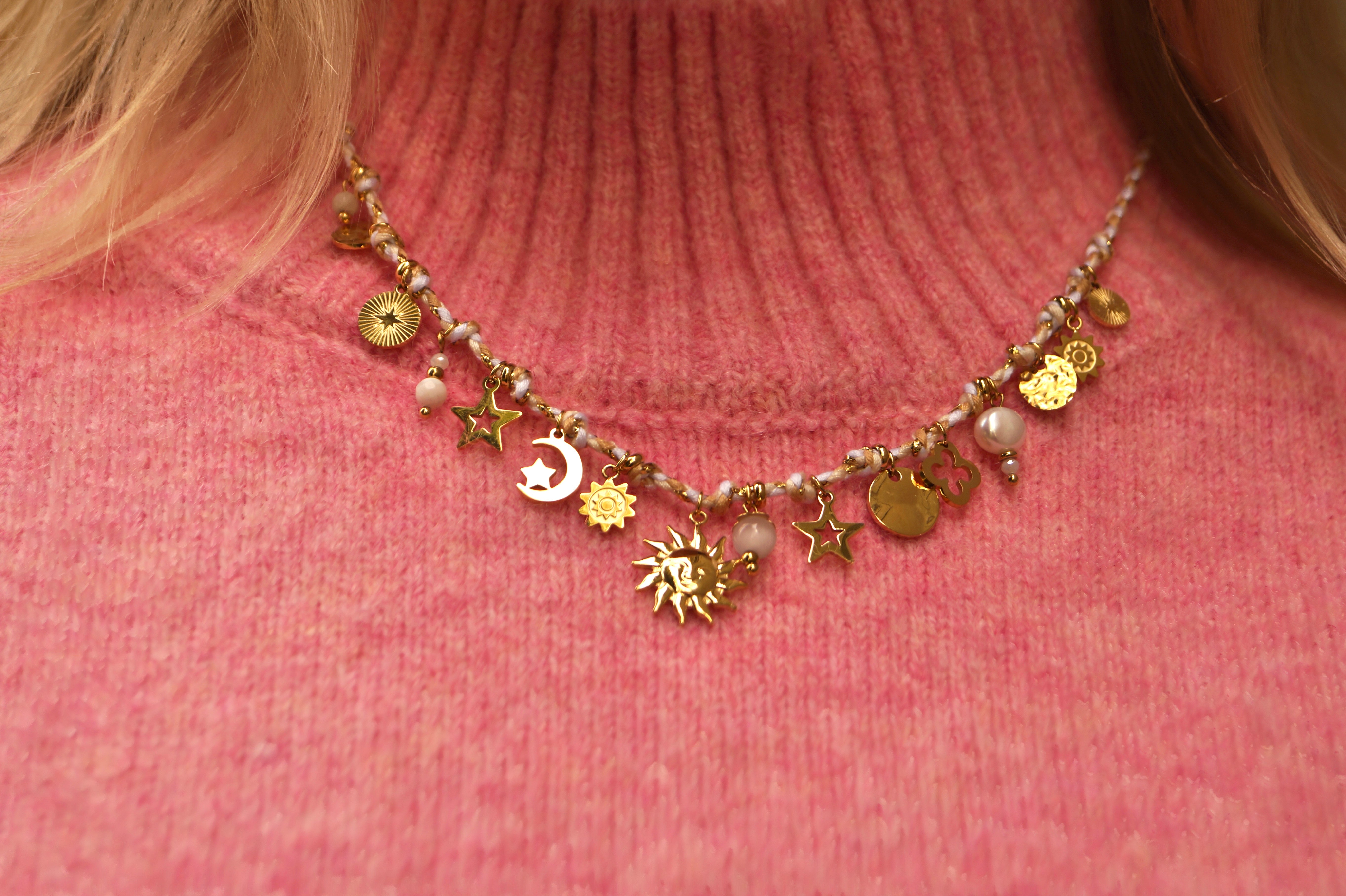 White Cord Sun & Moon Charms - Necklace